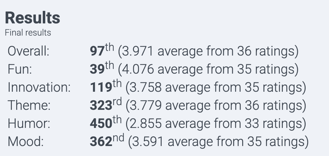 Out of ~1500 entries, our game got 39th place in Fun (top 2%) and 97th Overall (top 7%)!