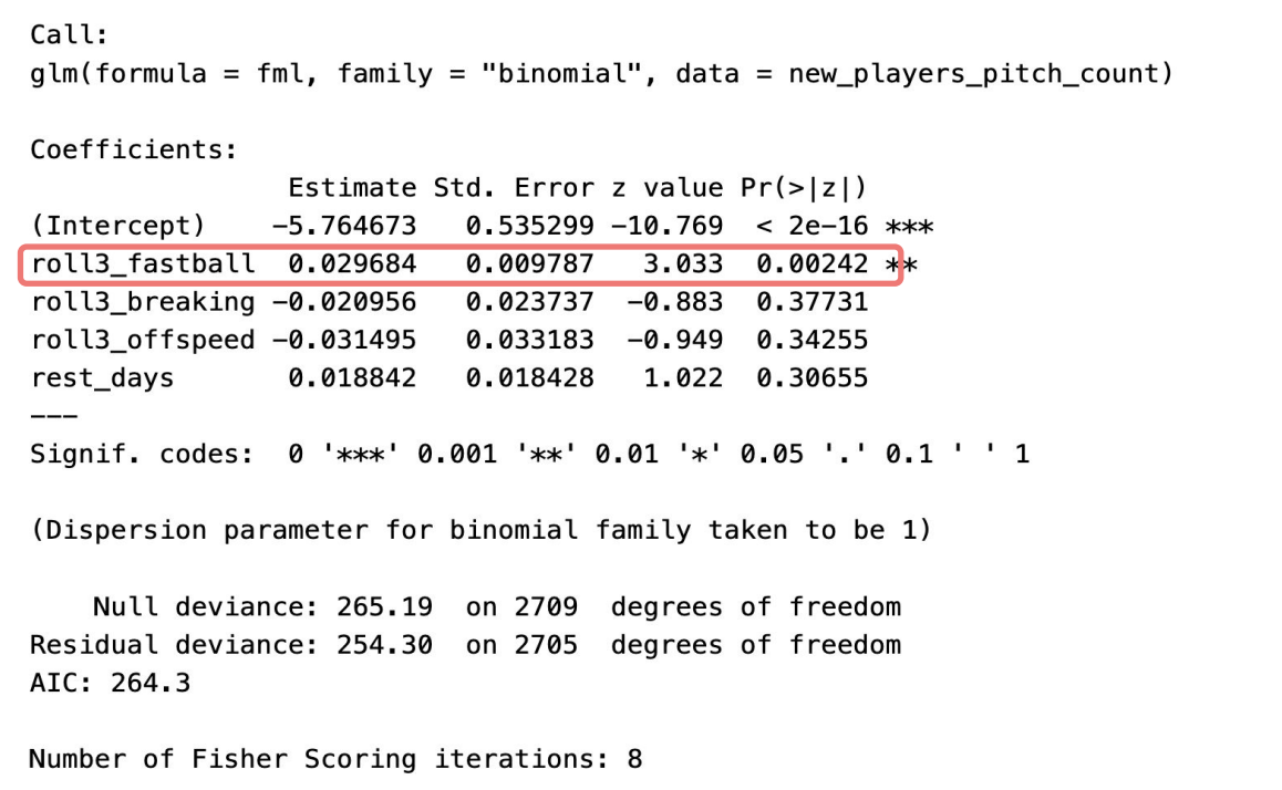 - Fit a logistic regression model to predict the chance of pitcher injury; achieved AUC of 0.69